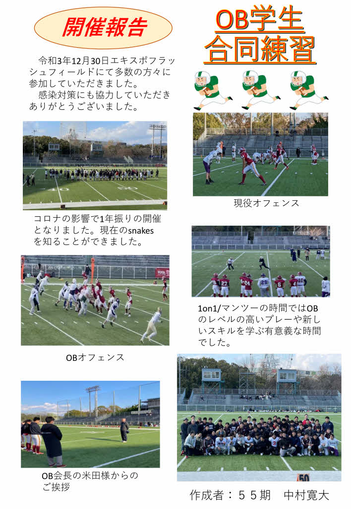 | OB戦 | 2020/ 1/ OB戦 | 秋季大会 | 2021/10/ 3 応援 追手門学院高校(無観客) | OB練習会 | 2022/ 1/ OB現役合同練習会 | 新人戦 | 2022/ 2/ 応援 | 春季大会 | 2022/ 3/ 応援 |